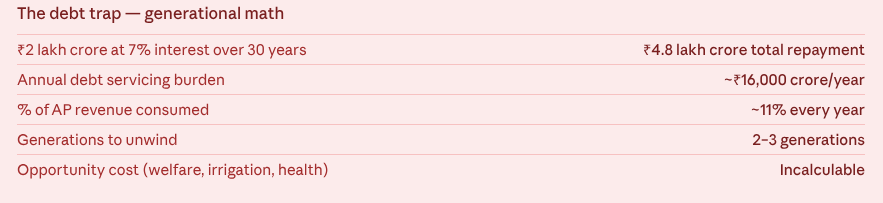 The numbers tell a brutal story. The capital region has now expanded to nearly one lakh acres. Providing basic infrastructure on roads, drainage, water, and electricity for even the first 50,000 acres would cost nearly ₹1 lakh crore. The expanded master plan doubles that to ₹2 lakh crore. Andhra Pradesh, one of India’s most debt-stressed states, generates annual revenues of roughly ₹1.3–1.5 lakh crore. To spend ₹2 lakh crore on one city’s infrastructure alone would consume more than a full year of state revenues with nothing left for health, education, welfare, or irrigation and that is just the foundation. The full vision of the Singapore-style metro, financial district, waterfront, and startup hub would cost multiples more.