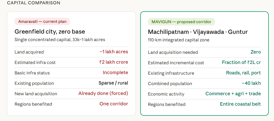 The MAVIGUN corridor is not opposition politics. It is a reckoning with geography, demography, and fiscal reality. You cannot pour the ambitions of Singapore into the revenue streams of a small state and expect anything but a decades-long debt hangover. Amaravati may yet get its name in an Act of Parliament. But a name is not a city. And a dream financed by debt is a burden, not a legacy.