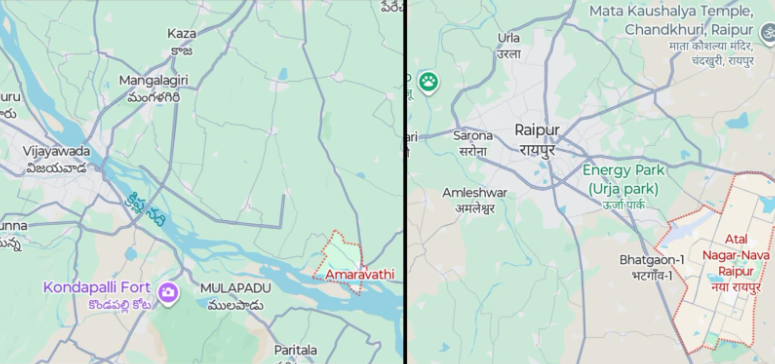 To understand the risks of building a greenfield capital, one must look at Nava Raipur in Chhattisgarh. Conceived as a modern capital with world-class infrastructure, it stands today as a cautionary tale. Despite decades of investment, its population remains far below expectations, hovering around 60,000 to 70,000. The city has roads, buildings, and administrative complexes, but lacks the organic vibrancy that comes from people, markets, and social interaction. What urban planners describe as the absence of “social glue” has left it struggling to evolve into a living, breathing city. The human cost has been equally severe, with thousands of hectares acquired and many farmers, after exhausting their compensation, reduced to laborers on land they once owned. The figure below illustrates a comparison between Amaravati and Naya Raipur, highlighting several similarities between them geographically.